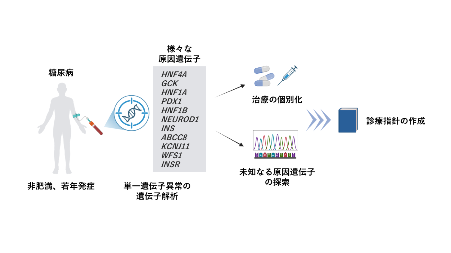 糖尿病の主なタイプは1型糖尿病と2型糖尿病で、どちらも多数の遺伝子が発症に関わっていることが知られています。一方、若い年齢で肥満を伴わずに糖尿病を発症し、1型糖尿病でない場合、一つの遺伝子の異常が糖尿病の原因となっていることがあります。これは「単一遺伝子異常による糖尿病」と呼ばれ、原因となる遺伝子が40以上知られています。そして、原因遺伝子がわかった場合、最適な治療法を選べる場合があります。しかし、単一遺伝子異常による糖尿病が疑われる場合であっても、原因となる遺伝子の解析が行われないことが依然多いのが現状です。